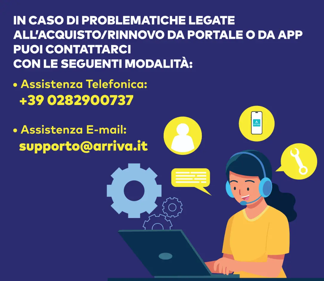 Per assistenza o segnalazioni relative all’app e agli abbonamenti digitali, potete contattare il supporto di Arriva con i riferimenti indicati nell’immagine seguente (📧 e ☎️).
