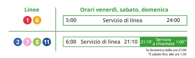 Il servizio è attivo venerdì, sabato e domenica dalle ore 21:10 alle ore 01:00.